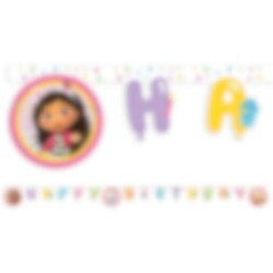 Vakker girlanders av papp med teksten "Happy Birthday" og fine motiver fra Gabbys Dukkehus. Girlanderen er 2 meter lang.
