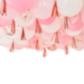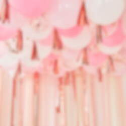 160 x ballonger i rosa og hvit, samt ballonger med roségull konfetti i størrelsene 30,48 og 12,7 cm i diameter.