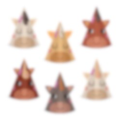 Disse sjarmerende festhattene har fargerike hesteansikter med ulike uttrykk og farger. En leken og søt detalj som gjør barnebursdagen enda festligere. Hattene er ca. 16 cm høye og holdes på plass med en komfortabel strikk.