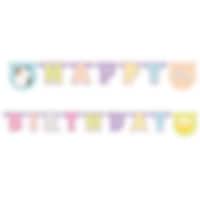 Stilig girlander av papp med teksten "Happy Birthday" og motiv fra Squishmallows. Girlanderen er 2 meter lang.