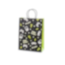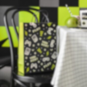 Gavepose som skiller seg ut med sitt kule design i videospill-tema. Posen har to håndtak, er laget av papir og er 10 x 32 x 24 cm stor.