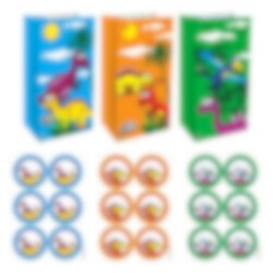12 stk godteposer med matchende klistremerker. Posene selges usortert og finnes i fargene på bildet. Dette betyr at du enten får 12 blå, 12 oransje eller 12 grønne poser med dinosaurmotiv og tilhørende klistremerker. Uansett hvilken farge du får, vil disse vakre godteposer bli verdsatt på barnebursdagen din.