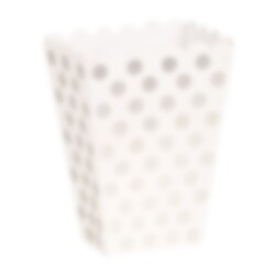 8 hvite snacksbokser med sølvfargede prikker. Disse boksene vil være perfekte for servering av popcorn eller chips på festen. Hvis du inviterer venner over på en filmkveld, vil disse være fine å dele ut slik at alle får hver deres lille boks. Disse vil være en fin dekorasjon til borddekkingen enten de er fylt med nøtter, popcorn, godteri eller andre godsaker. Snacksboksene er laget av papp, ca. 11 x 14 cm store.
