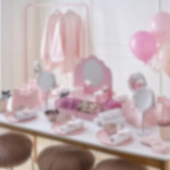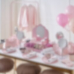 Gi festen din en luksuriøs touch med denne fantastiske godteri- og snackstativet i form av et sminkebord. Perfekt for en morsom temafest, med rosa prikkete bokser, søte godteriskåler og et speil for ekstra glamour. Fyll den med dine favorittsnacks og la festen begynne!