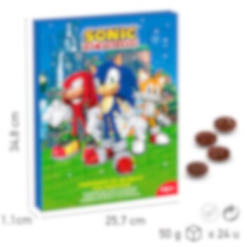 Julekalender med deilige sjokoladebiter i Sonic the Hedgehog-tema. Kalenderen er ca. 35 × 25 cm stor.