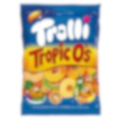 Sure søtede gelégodterier som er formet som ringer med forskjellige tropiske fruktsmaker. Vekt 100 gram.