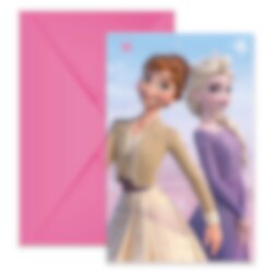 6 stk. flotte invitasjonskort med motiver av Elsa og Anna fra filmen Frost 2. Perfekt å sende ut til vennene dine for å invitere til en morsom bursdagsfest. Dekk også bordet med våre tilhørende produkter i samme tema Frost 2 Wind Spirit, for eksempel tallerkener, kopper, servietter og bordduk.