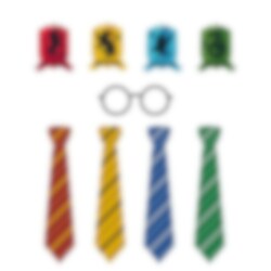 Settet inneholder slips i studenthusenes forskjellige farger, svarte briller og merkelapper med de forskjellige navnene på studenthusene.