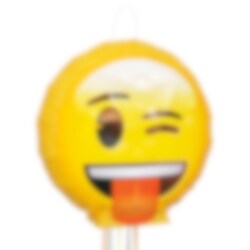 Denne morsomme emoji-piñataen blir et fargerikt innslag i bursdagen! Med sitt rampete uttrykk og fargerike bånd er den både pynt og en spennende lek. Barna trekker i snorene én etter én – men bare én av dem åpner piñataen og slipper ut godteriet. Latter og spenning loves!