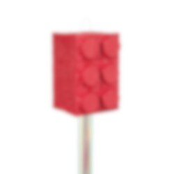 Fin piñata formet som en rød byggekloss – perfekt for bursdagsfesten! Piñataen har snorer som henger under den, og barna drar i snorene for å åpne den. Én av snorene gjør at piñataen åpnes og innholdet faller ut.