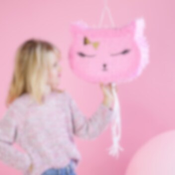 Pinata som forestiller en rosa katt. Fyll pinataen med godteri og leker og la barna dra i snørene for å se hvem det er som tømmer innholdet. En morsom sak å avslutte festen med. Pinataen er ca. 35 x 27 x 9 cm stor og selges tom.