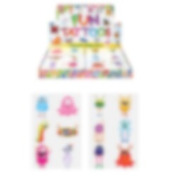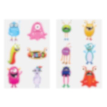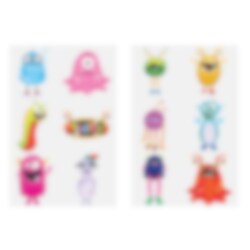 6 stk tatoveringer med motiv av søte monstre i morsomme farger. Morsomme å ha med i godteposem som vennene får på bursdagen. Observer at tatoveringene finnes på to forskjellige ark og de selges stykkevis og usorterte.