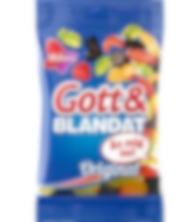 Påse med blandning av frukt och lakritsgodis. Påsen innehåller 50 gram.