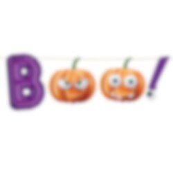 Flott girlander som viser ordet "BOO!". En morsom ting å henge opp når man skal dekorere til halloween. Girlanderen er laget av papp, har trykk på den ene siden og er 150 cm lang. Bokstavene er mellom 16-19 cm høye.