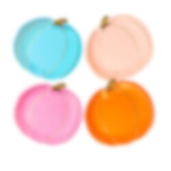 8 superfine papptallerkener formet som gresskar med glitrende gulldetaljer. Tallerkenene er ca. 22 cm i diameter og kommer i fire farger: 2 rosa, 2 fersken, 2 oransje og 2 blå.
