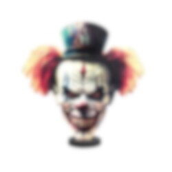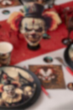 Skremmende bordsdekorasjon i tre med en skummel morderklovn, perfekt for å skape en uhyggelig stemning på det dekkede bordet til Halloween. Figuren står stabilt på en treplate og kan brukes som pynt på neste fest etter feiringen.