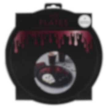 8 stk. svarte tallerkener med rødt folie som forestiller bloddråper. Perfekt å dekke bordet med på halloweenfesten. Tallerkenene er 25 cm i diameter og er laget av papp.
