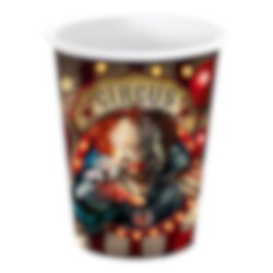 6 stk. pappkopper i skummelt sirkus-tema som passer perfekt til Halloweenfesten. Koppene er ca. 9 cm høye og rommer 240 ml.