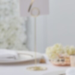 Flott, gullfarget kortholder fra temaet Gold Wedding. Passer perfekt til å holde for eksempel bordnummere. Kortholderen er 22 cm høy. Prisen er per stykk.