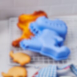 Et flott bakesett for kreativ bakelek, forberedelser til bursdag eller som gave til barn som liker dinosaurer og å skape på kjøkkenet.