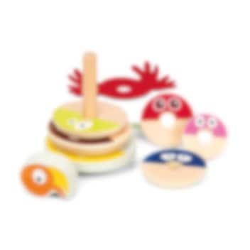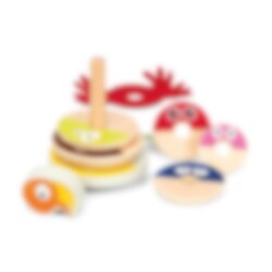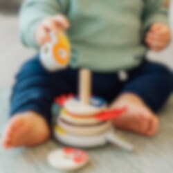 Stableleketøy i herlige farger og motiv fra den populære barneprogrammet Babblarna. Et verdsatt leketøy å gi til dåpsbarnet, da dette er en klassisk leke som er morsom å leke med samtidig som den utvikler barnets finmotorikk. Forpakningen innenholder 8 stk. treringer i ulike størrelser, en klossbit som forestiller Babblarna sin venn Faffa, samt Faffa sine røde vinger i myk filt. Leken er 100x100x140 mm stor.