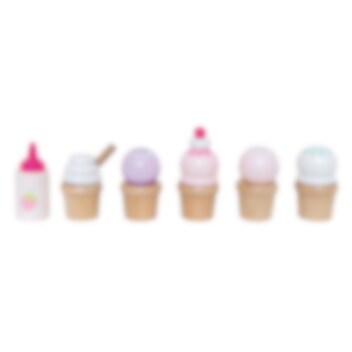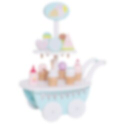 Isvogn med tilhørende is i pastellfarger, alt er laget av tre. En morsom leke fra Jabadabado å gi til barnet som skal døpes eller fyller år. Pakken inkluderer 1 isvogn på hjul, 5 stk. kuleis/softis, 5 stk. pinneis, 1 isskje og 1 flaske med jordbærtopping. Kuleisene og softisen er avtakbar så du selv kan sette sammen isen din. Isvognen er 31 x 18 x 40 cm stor.