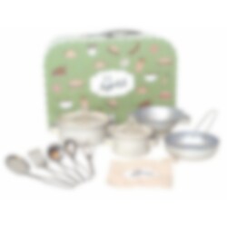 Kjøkkensett med 5 stk. forskjellige kjøkkenutstyr i form av 2 stk. gryter, 1 stk. stekepanne, 1 stk. dørslag og 1 stk. gryteklut. Alt er pent pakket i en pappveske. Vesken kan snus og brukes som kokeplate, da det er avbildet 2 stk. kokeplater på baksiden. Her er alt den lille kokken måtte trenge på kjøkkenet. Med dette kjøkkensettet kan barnet ditt ha det gøy lenge. Et morsomt leketøy hvor du også kan bruke redskapene til å røre i ekte gryter. La barnet ditt være med og lag fantastiske retter på kjøkkenet.