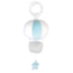 Spilledåse som forestiller en luftballong i hvit og blå. En kjempefin gave å ha med til dåpen som foreldrene senere kan henge i eksempelvis barnevognen. Spilledåsen er laget av velur, bomull og plast og kan kun vaskes utenpå med en klut. Spilledåsen er ca 26 cm høy.