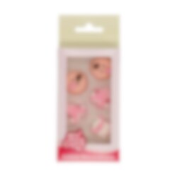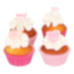 8 stk. sukkerdekorasjoner som representerer rosa babyting. Morsomt å pynte kaken eller bakverket med når det er tid for babyshower.