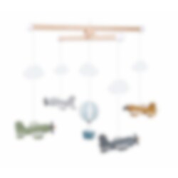 Uro i tre fra Jabadabado med tilhørende figurer i form av fargerike fly og luftballonger, som holdes sammen med et snøre. En flott dåpsgave som foreldrene kan henge over barnesengen eller stellebordet for å stimulere barnets sanser og bevegelser i løpet av de første månedene. Uroen er 36 x 36 x 36 cm stor.