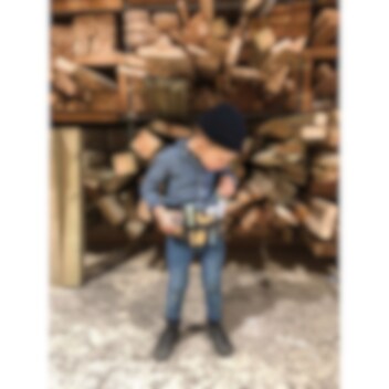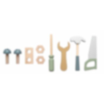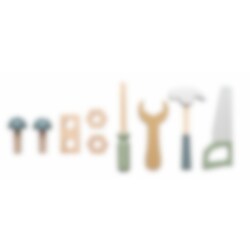 Stilig verktøybelte med tilhørende verktøy i tre, som du kan bruke for å hjelpe til hjemme når det er bruk for å spikre og banke litt. En kul gave til et barn som skal døpes.