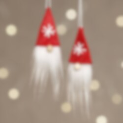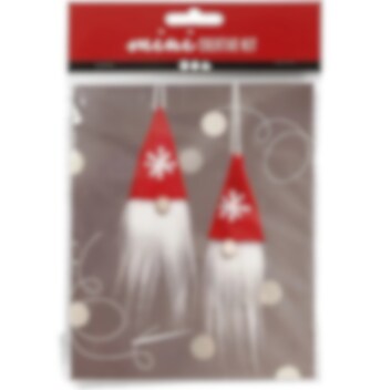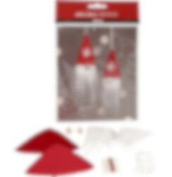 Materialsett/kit for 2 sydde nisser som kan henges, med langt skjegg og lue i fløyel. Beskrivelse følger med.