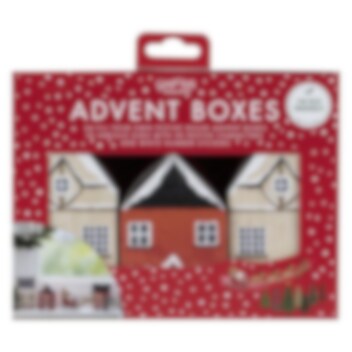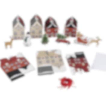 Herlig DIY-adventskalender med luker som blir til en koselig julelandsby. Fyll lukene med godteri og leker som de minste kan åpne hver dag. Kalenderen er morsom og enkel å sette opp. Pakken inneholder: 24 stk. esker i papp formet som små hus, 12 stk. 3D-figurer i papp, 1 stk. ark med nummererte klistremerker og 24 stk. røde garnbiter som eskene kan knytes sammen med. Produktet og forpakningen er resirkulerbare og FSC-sertifiserte.