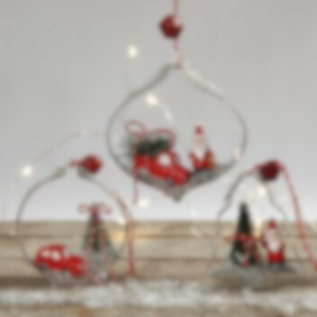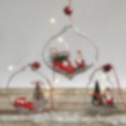 2 stk. små biler i fargene rød, hvit og svart, som er en stilig detalj å ha med når man skal pynte før nissen kommer på ferie eller julebesøk. Bilene er ca. 2 x 4 cm store.