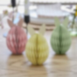 Dekorer bordet ditt med disse søte påskeharene i pastellfarger. Disse honeycomb-dekorasjonene er den perfekte måten å legge til en touch av påske til enhver bordsetting. Du kan også bruke den medfølgende tråden hvis du vil henge dem opp.