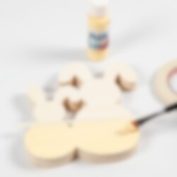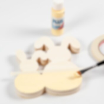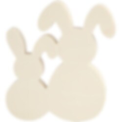 To sammenkoblede harer/kaniner i lyst tre som du kan male med hobbymaling. Figuren kan stå fritt. Harene er ca 17 cm høye.