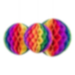 3 stk. herlige dekorasjoner i form av honeycombs i Pride-tema. Dekorasjonene er 15 cm, 20 cm og 25 cm i diameter og henges opp med tilhørende snøre. Laget av papir.