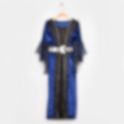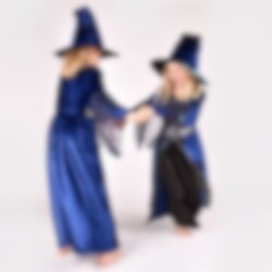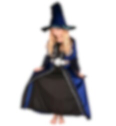 Føl deg som en magisk heks i denne fortryllende blå kostymen. Kjolen er laget av myk fløyel og pyntet med glitrende og skimrende detaljer, inkludert et sølvbånd i midjen med en glitrende måne. En matchende, rynkete heksehatt fullender din magiske look.