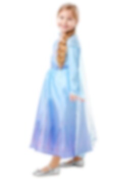 Frost 2 Elsa kostyme deluxe inkluderer en flott kjole i blått med fine og luksuriøse detaljer. Kjolen finnes i tre størrelser som passer barn fra 3-4 år opp til 7-8 år. Lagd av 100 % Polyester. Dette er et offisielt lisensiert Disneyprodukt. Sko og parykk er ikke inkludert.