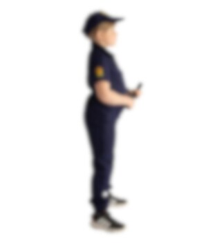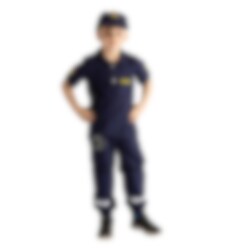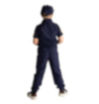 Det følger også med et par matchende mørkeblå bukser med strikk i livet og refleks, et enklere belte med sølvfarget spenne og en matchende politihatt med politisymbol på.