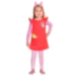 Peppa Gris kostyme inkluderer en kjole med tilhørende hale, et hårbånd med ører, et par rosa leggings og et kosedyr. Sko inngår ikke.