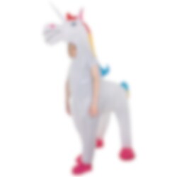 Oppblåsbart enhjørningskostyme til barn. Et morsomt kostyme som garantert vil trekke til seg oppmerksomheten under halloween- eller kostymefesten. Laget av 100% polyester. Kostymet er i one size og passer barn som er ca. mellom 135-164 cm høye. I pakken kan du finne instruksjoner på engelsk og fransk for hvordan man får på seg kostymet. For å blåse opp kostymet trenger du 4 stk. AA-batterier. Vær oppmerksom på at batterier ikke er inkludert.