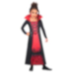 Vampyr Kostyme inkluderer kjole i svarte og røde farger med fine detaljer. Sko medfølger ikke. Drakten er laget av 100% polyester og finnes i en størrelse som passer til barn mellom 6 år til 8 år. Skal vaskes for hånd og lufttørkes.