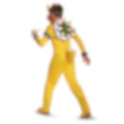 Bowser-kostyme deluxe inkluderer en gul helkroppsdrakt med mange fine detaljer, et oppblåstbart skall og en maske lager av plast, som dekker ansiktet. Drakten er lager av 100% polyester. Vaskes for hånd med litt vann og drypptørkes.