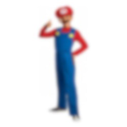 Super Mario Bros - Mario Classic Kostyme inkluderer en jumpsuit, en rød hatt og en avtakbar svart bart. Drakten fås i én størrelse som passer til barn mellom 10-12 år. Drakten er laget av 100% polyester. Sko er ikke inkludert. Dette er et offisielt lisensiert produkt.