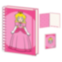 Notatboken i A5-format har et rosa omslag med Princess Peach i sin kjente kjole, spiralrygg og linjerte sider. Passer perfekt til skole, dagdrømmer og hemmelige planer i Soppriket.