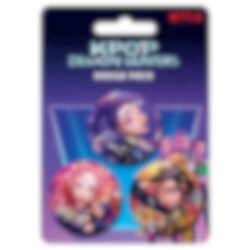 Tre runde badges fra Netflix-serien K-Pop Demon Hunters, der hver knapp er prydet med en av seriens karakterer i typisk K-pop-glam-stil. Festes enkelt med sikkerhetsnål på baksiden.