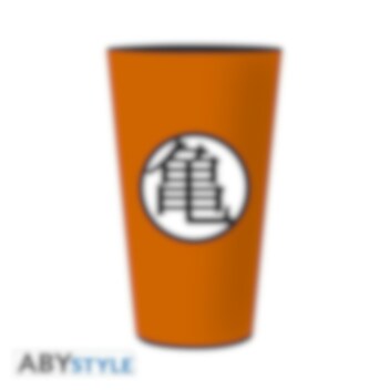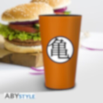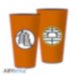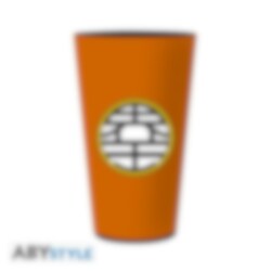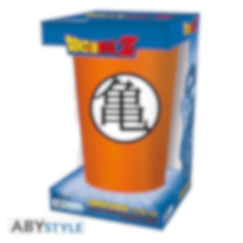 Stiligt drikkeglass i oransje farge med motiver av Kame og Kaio logoene i kanji fra Dragon Ball Z. En passende gave til personen som elsker Dragon Ball Z.