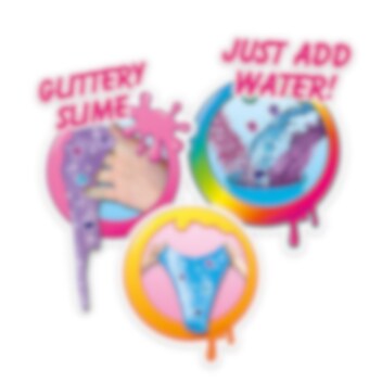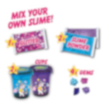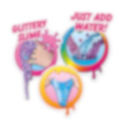 Et morsomt DIY-sett med enhjørningtema, som inneholder alt du trenger for å lage ditt eget slim hjemme- du trenger kun å komplementere med vann. På baksiden av pakken står det enkle instruksjoner på hvordan du skal gå frem. Slimet inneholder ikke BPA eller gluten.