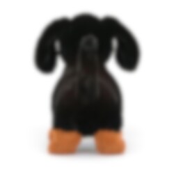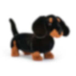 En søt, kjærlig og uredd liten dachs i kulsort med oransje-brune flekker. En pen liten hund med foldede ører, en søt liten hale, oransje øyenbryn, nysgjerrige brune øyne og en glad og ganske cocky holdning. Denne lojale og lekne lille krabben lengter etter å ha det gøy, dra på eventyr, kose seg og sove med deg. Laget av 100% polyester og håndvaskes om nødvendig.